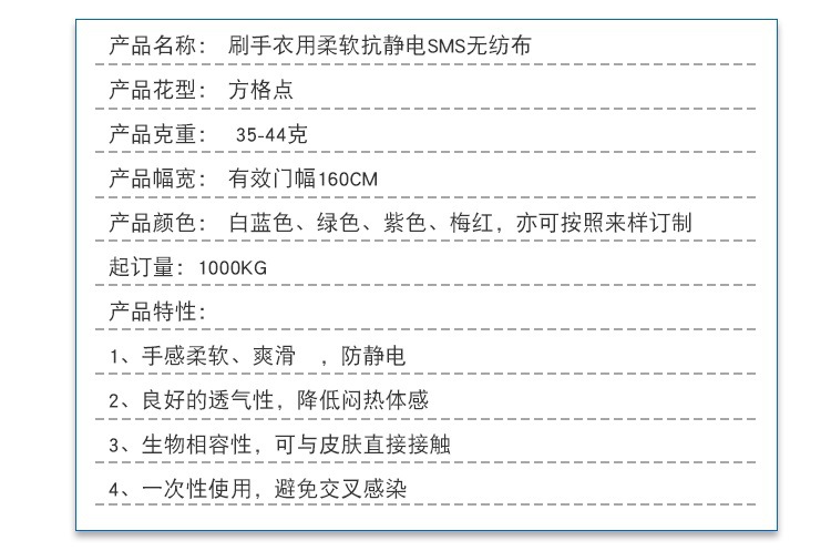 產(chǎn)品摘要:品質(zhì)標(biāo)準(zhǔn) 中國紡織行業(yè)標(biāo)準(zhǔn)(FZ) 主要成分 無紡布 幅寬 有效門幅160cm 克重 35-44克(g/㎡) 成網(wǎng)方式 紡絲 主要用途 醫(yī)療衛(wèi)生用布,家居家紡用布,收納、包裝用布 貨號